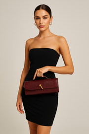 This luxurious handbag with its elegant crocodile design is a statement piece for style-conscious women. The textured finish in deep wine red perfectly harmonizes with the gold-tone closure detail – an iconic accessory for evening looks, events, or fine dining moments.