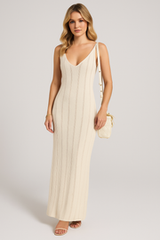 • Cut: Figure-hugging with maxi length and low back neckline